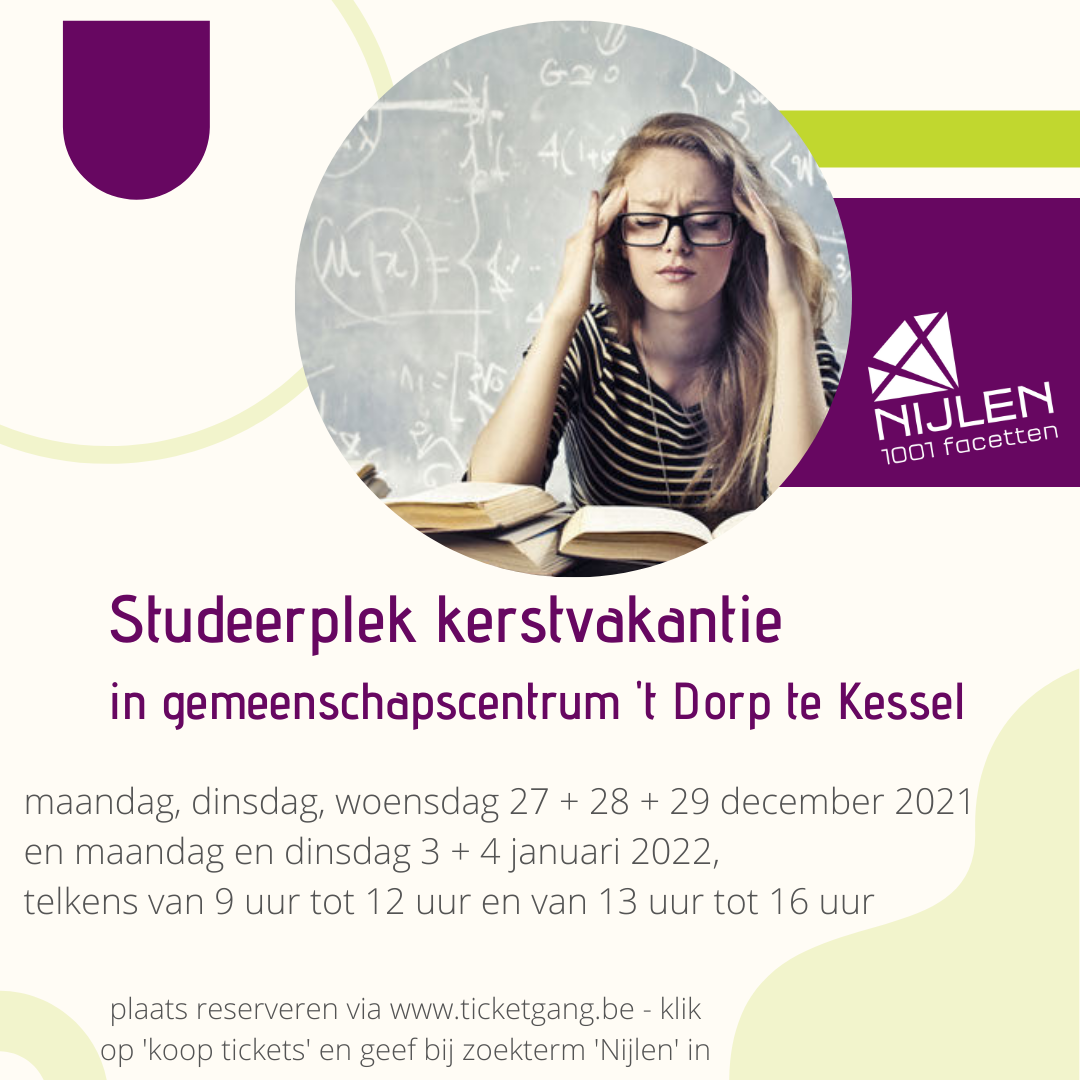 Studenten die in alle rust willen studeren, kunnen tijdens de kerstvakantie 2021-2022 gedurende vijf dagen ook terecht in gemeenschapscentrum 't Dorp te Kessel. De ruimte is geopend op: